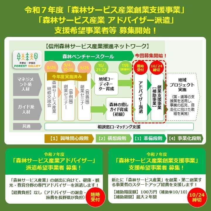 信州森林サービス産業推進ネットワークでは、長野県内で「森林サービス産業」に取り組んでいる、または「森林サービス産業」の創業・第二創業に関心がある地域関係者を対象にした段階的なスタートアップ支援を開始します。